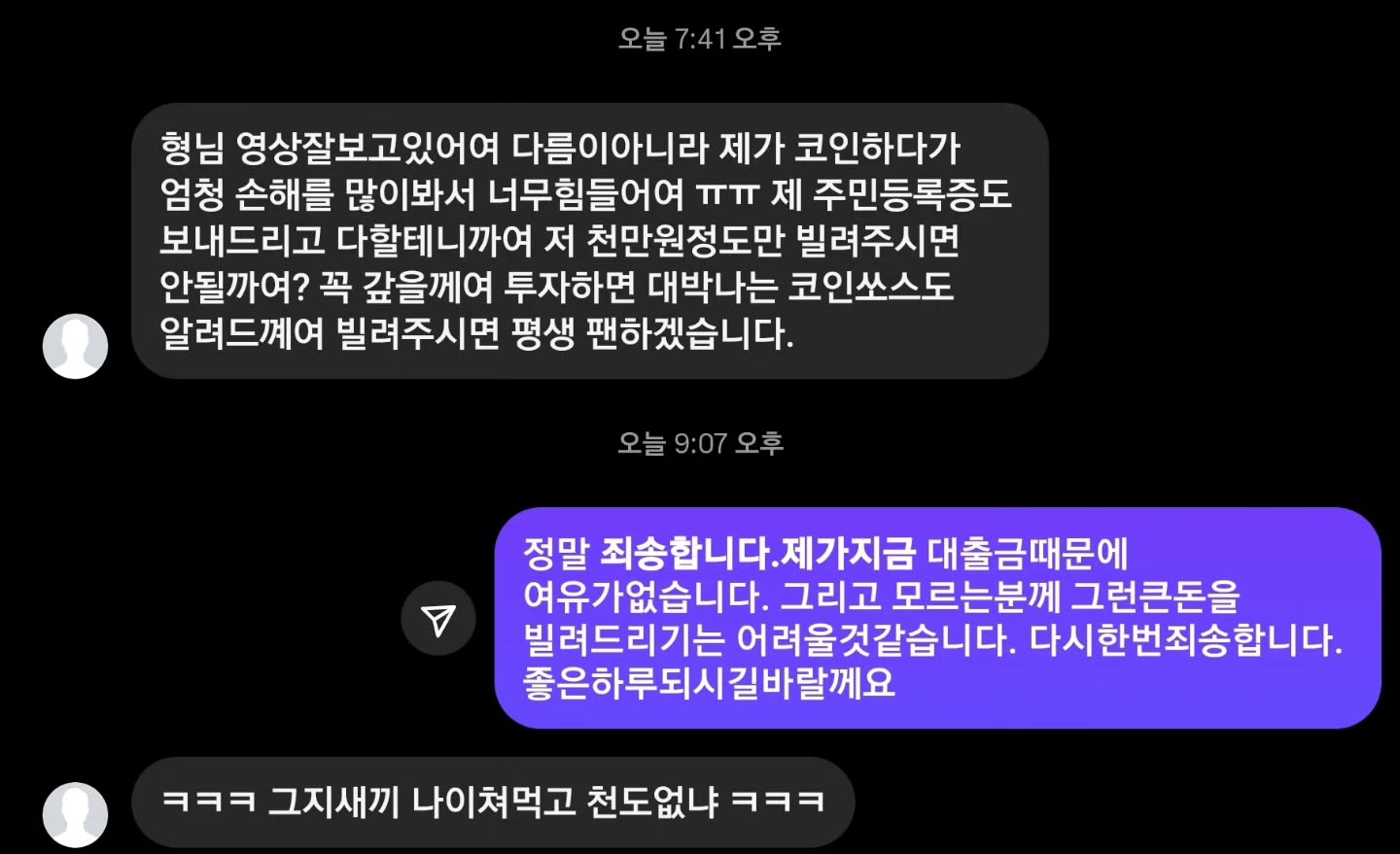 공개한 캡처에는 익명의 인물이 "형님 영상 잘 보고 있어요. 다름이 아니라 제가 코인하다가 엄청 손해를 많이 봐서 너무 힘들어요. 제 주민등록증도 보내드리고 다 할 테니까 천만원 정도만 빌려주시면 안 될까요? 꼭 갚을게요. 투자하면 대박나는 코인 소스도 알려드릴게요. 빌려주시면 평생 팬하겠습니다"라며 천 만원을 빌려달라고 요구하고 있다.