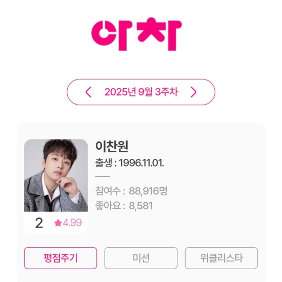 최근 아이돌차트에 따르면, 이찬원은 9월 3주 차 평점랭킹에서 2위를 기록했다.