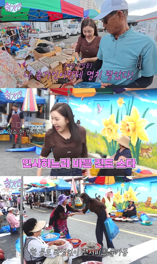여러 사람과 인사를 나눈 송가인은 구매 리스트에 있는 멸치를 사기 위해 건어물 가게로 향했다. 건어물 가게의 상인은 "송가인이를 테레비에서만 봤는데 실물도 본다"며 놀라움을 감추지 못했고, 주변에 있는 사람들에게 "나 송가인이한테 멸치 팔았다!"고 환호해 옷음을 자아냈다.