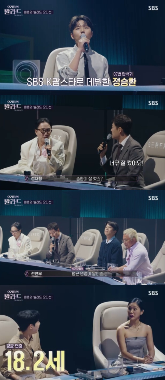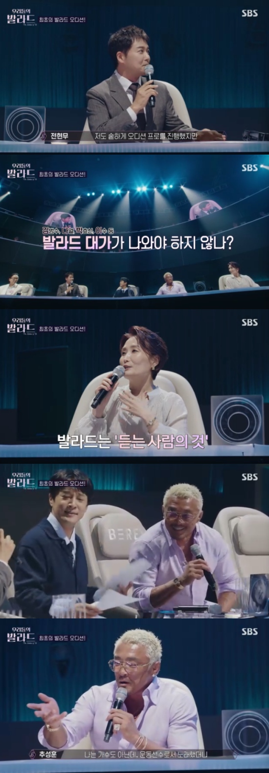 23일 SBS 새 예능 프로그램 '우리들의 발라드'가 첫 방송됐다. 심사위원으로 전현무, 정재형, 추성훈, 차태현, 박경림, 대니 구, 크러쉬, 미미, 정승환이 출연했다.