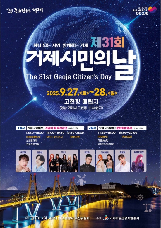 이번 행사는 '하나 되는 시민 함께하는 거제'라는 주제 하에, 9월 27일부터 9월 28일까지 양일간 고현항 매립지 일원에서 열린다. 그리고 기념식, 축하공연, 문화·체험 프로그램 등 다채로운 행사를 통해 시민들이 함께 참여하고 즐길 수 있는 화합과 우정의 장을 마련할 예정이다.