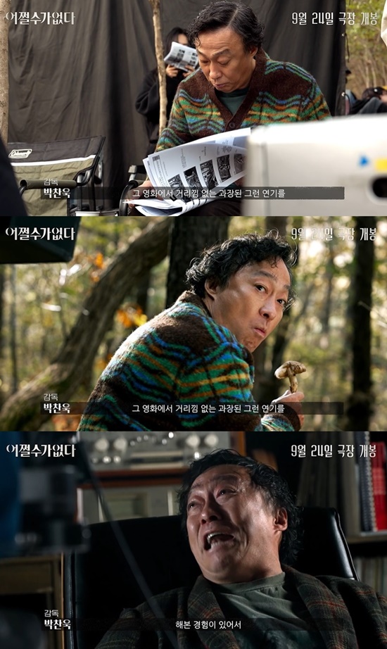 또 "동네에서 (연기로) 애들 좀 패고 다닌다고 생각했는데, (박 감독을 만나니) 산 속에 도사 한 분이 있는 느낌이었다. 감독님을 처음 만났을 때 다리도 후덜덜 떨리고 그랬었다. 감독님이 내 연기에 실망할까봐, 그것 때문에 소극적으로 변하기도 했다"고 멋쩍게 웃었다.
