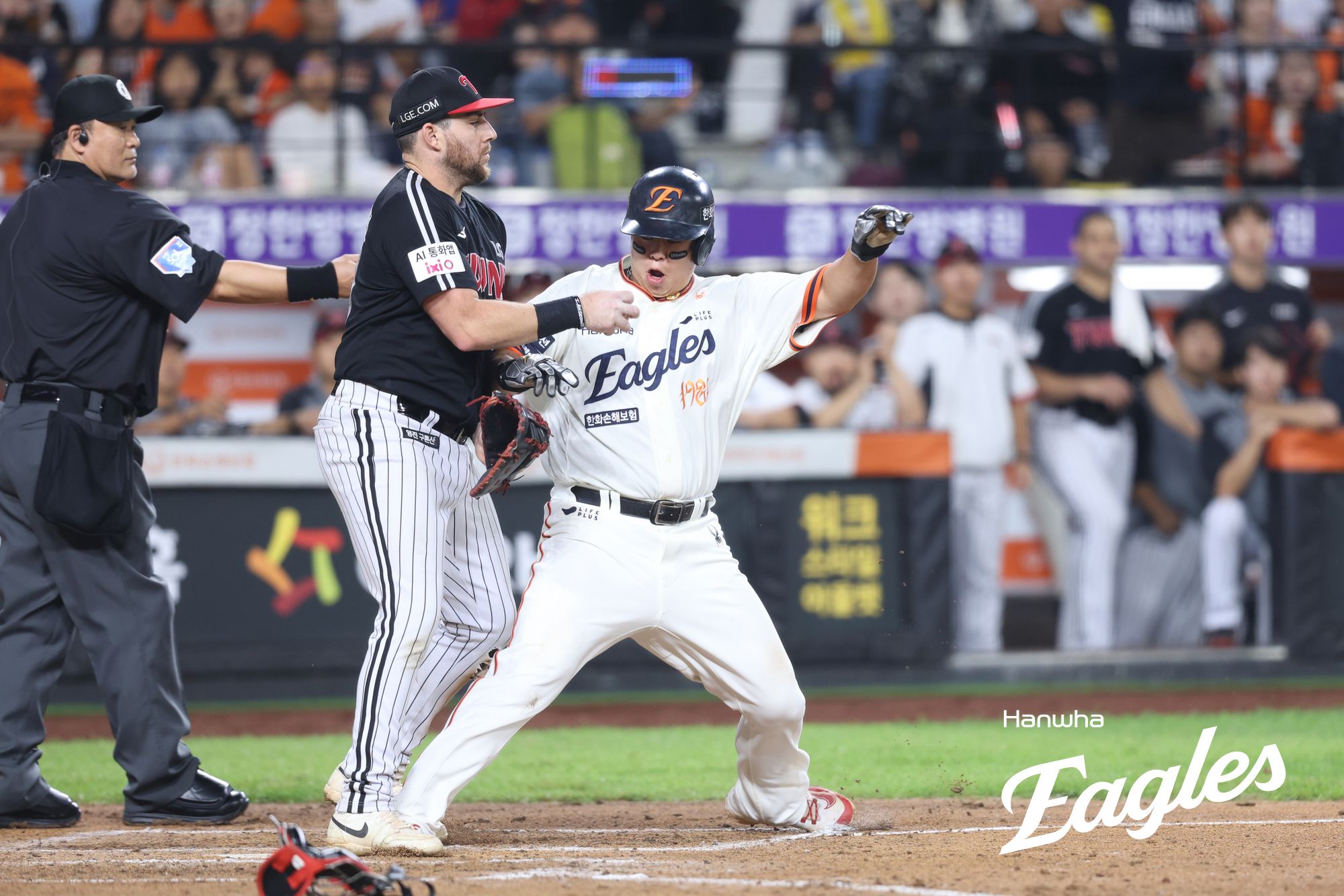 노시환이 먼저 홈플레이트를 밟으면서 비디오 판독 끝에 한화의 득점이 인정됐다. 점수는 1-1 동점.