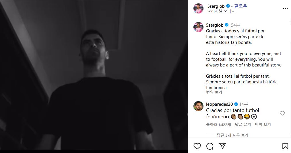 부스케츠는 26일(한국시간) 자신의 SNS에 "모두에게, 그리고 축구에게 진심으로 감사를 전한다. 여러분은 항상 이 아름다운 이야기 속의 일부로 남을 것이다"라며 감사의 마음을 전하는 동영상을 함께 게시했다.