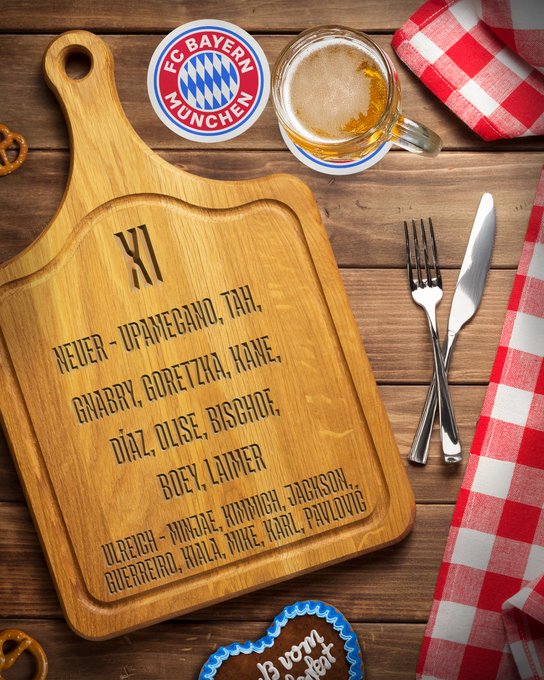 뱅상 콤파니 감독이 이끄는 뮌헨은 이날 4-2-3-1 전형을 가동했다. 골문은 주장 마누엘 노이어가 지킨 채 콘라트 라이머, 요나탄 타, 다요 우파메카노, 사샤 보이가 백4를 구성했다. 3선에는 톰 비쇼프와 레온 고레츠가 나서며 공수를 연결했다. 2선에는 루이스 디아스, 세르주 그나브리, 마이클 올리세가 선발 출격했고, 최전방 원톱 자리에는 해리 케인이 이름을 올렸다.