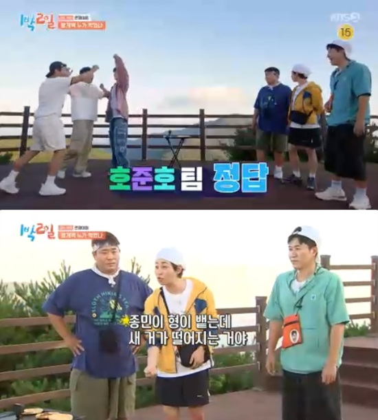 28일 방송된 KBS 2TV '1박 2일 시즌4'에서는 김종민이 고추냉이 망개떡에 연기력을 폭발시키는 모습이 전파를 탔다.