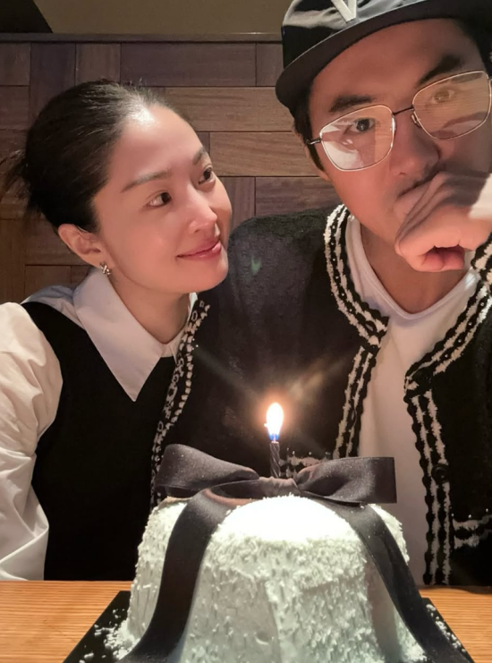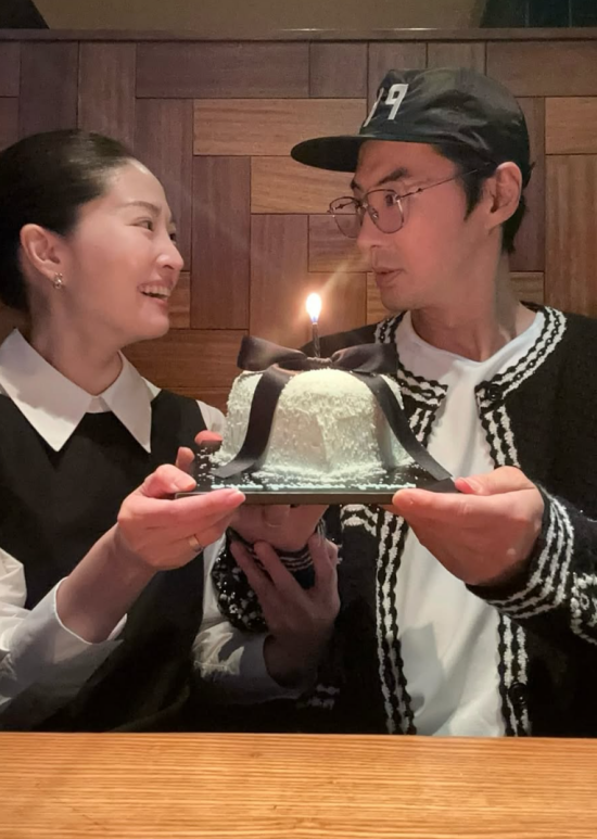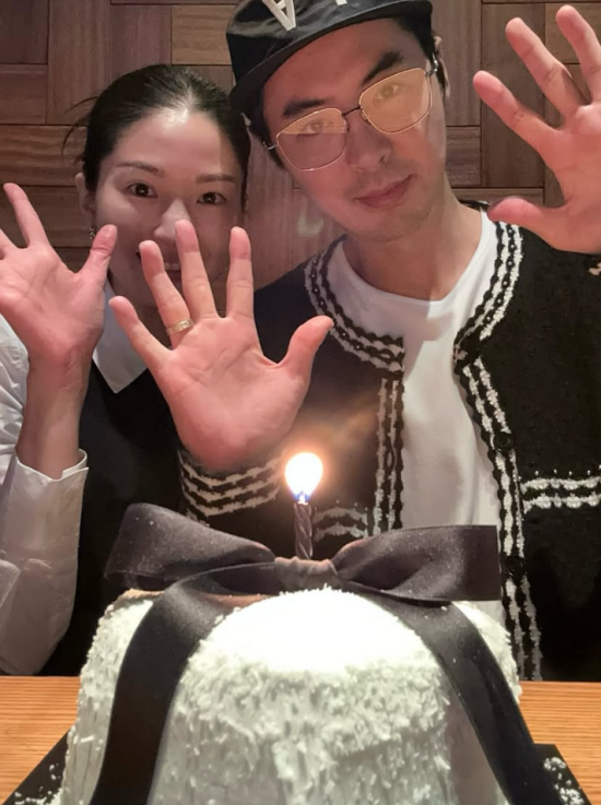 사진 속 전진과 류이서는 리본 장식이 달린 하트 케이크를 앞에 두고 결혼기념일을 축하하고 있다.