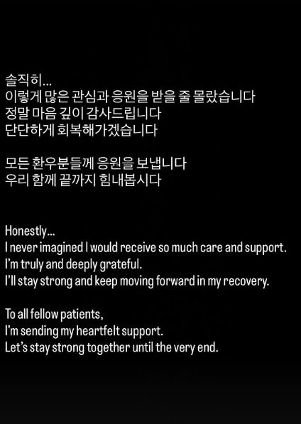 더불어 "모든 환우분들께 응원을 보낸다. 우리 함께 끝까지 힘내보자"고 덧붙이며 자신을 비롯한 투병 중인 환우들에게 응원의 말을 전했다.