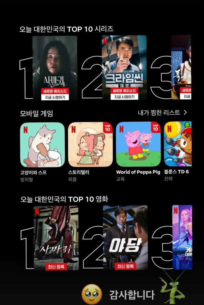 공개된 사진에는 넷플릭스 화면이 담겨 있다. '오늘 대한민국의 TOP 10 시리즈'에서 고현정이 출연한 '사마귀: 살인자의 외출'(이하 '사마귀')이 당당히 1위를 기록한 것. 고현정은 이를 직접 캡처하며 시청자들에게 고마운 마음을 전했다.