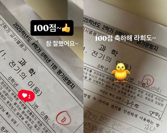 현재 초등학교 6학년인 슈의 딸 라율은 과학 시험에서 만점을 받았다고. 슈는 시험지를 공개하며 '100점'을 인증했다. 더불어 "100점 축하해 라희도"라며 라희 역시 100점을 받았다고 밝혀 눈길을 끌었다.