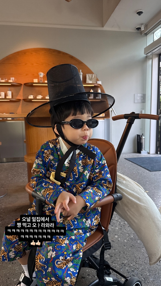 이어 1일에는 짙은 푸른색 바탕에 호랑이와 구름이 그려진 전통문양의 도포를 입고, 검정 갓에 선글라스까지 더한 패션을 자랑한 아들 준범의 사진을 공유하며 "오늘 도보로 등원하는데 사람들 다 쳐다봄"이라고 글을 적었다.