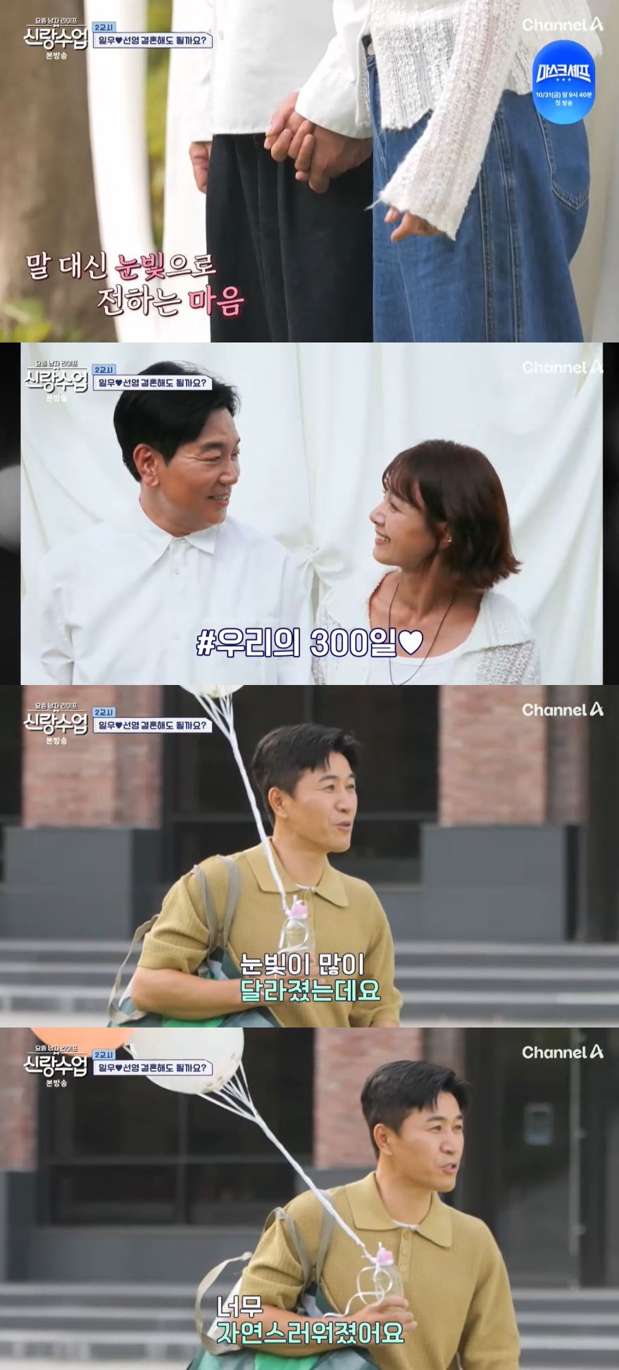 손을 잡은 두 사람은 마주보며 다정한 미소를 지으며 300일 기념 사진을 촬영했다. 이를 본 문세윤은 "사진 잘 찍어서 청첩장에 넣으면 되겠다"라고 말했다.