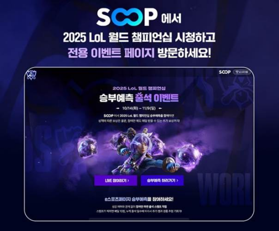 SOOP은 2일(목) 오후 2시부터 ‘2025 LoL 월드 챔피언십(이하 월즈 2025) 이벤트 페이지를 운영하며, 대회 기간 동안 유저들이 직접 참여할 수 있는 다양한 프로그램을 선보인다고 밝혔다. 이번 이벤트는 월즈 2025 기간에 맞춰 마련됐으며, 승부예측, 응원 메시지 릴레이, 시청 드롭스 등 다양한 프로그램으로 팬들에게 즐길 거리를 제공한다.
