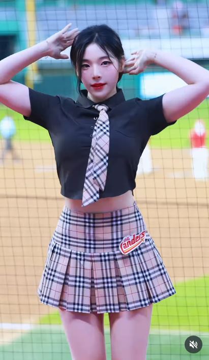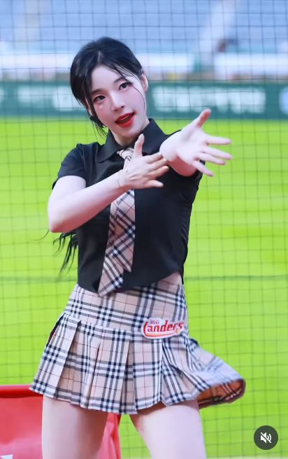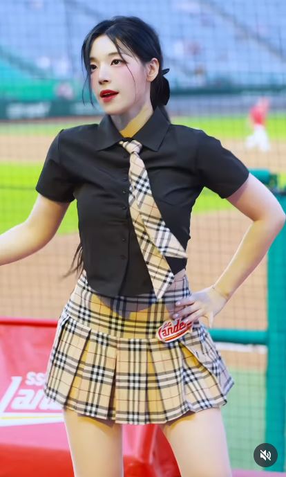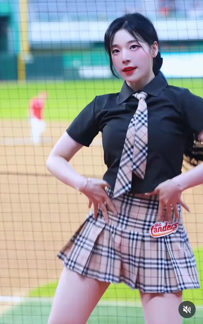 영상 속 조연주는 검은색 상의에 체크무늬 넥타이와 치마를 매치해 교복 스타일을 완성했으며, 하의에는 SSG 랜더스 마크가 부착되어 있어 응원 현장 분위기를 그대로 담아냈다.