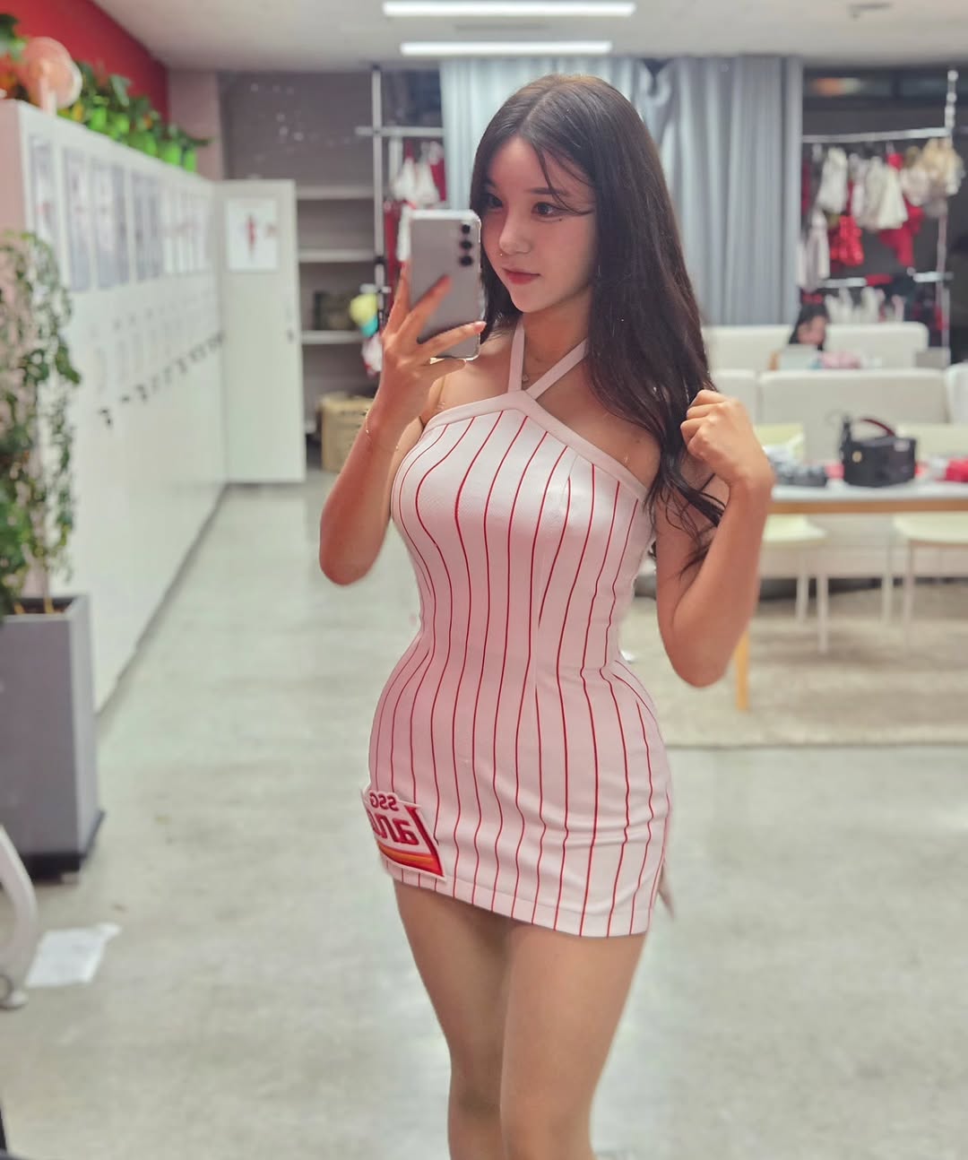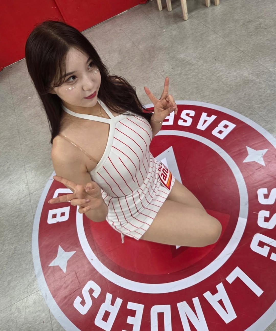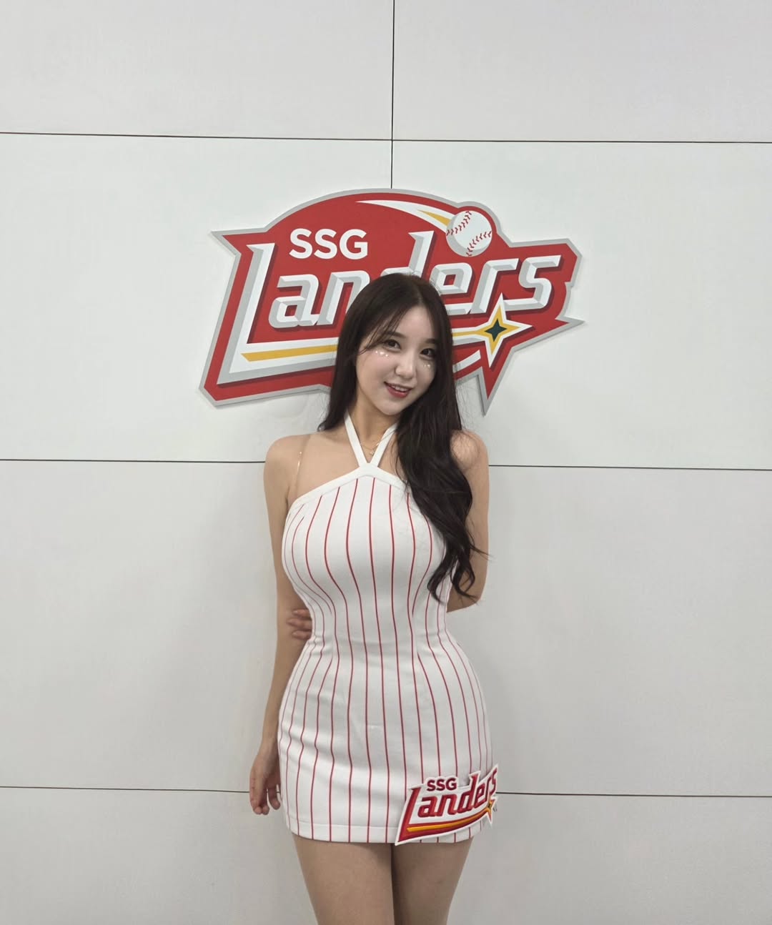사진 속 그는 SSG 랜더스의 로고가 새겨진 흰색 바탕의 빨간 스트라이프 원피스를 입고 포즈를 취하고 있다. 짧은 기장과 몸매 라인을 강조하는 디자인이 돋보이는 이번 의상은 그의 우월한 비율과 늘씬한 실루엣을 더욱 부각시켰다.