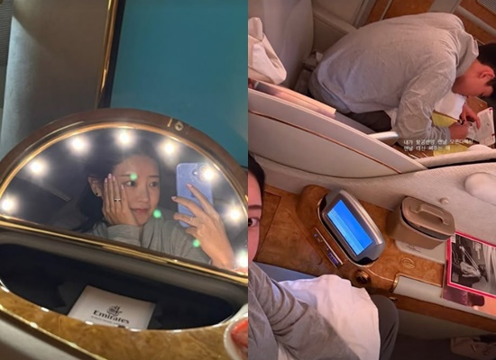 공개된 사진에는 조유민과 함께 비행기 1등석에 탑승해 이동 중인 소연의 모습이 담겨 있다.