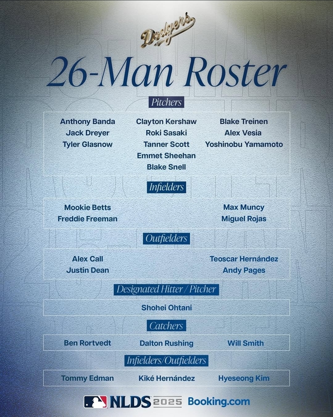 다저스는 5일(이하 한국시간) 미국 펜실베이니아주 필라델피아의 시티즌스뱅크파크에서 열리는 2025 미국 메이저리그(MLB) 포스트시즌 내셔널리그 디비전시리즈 1차전을 앞두고 26인 로스터를 발표했다.