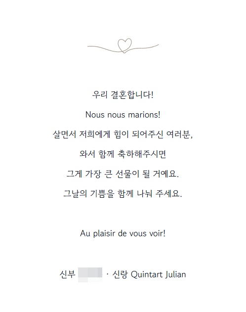 두 사람은 청첩장에 "우리 결혼합니다! 살면서 저희에게 힘이 되어주신 여러분, 와서 함께 축하해주시면 그게 가장 큰 선물이 될 거예요. 그날의 기쁨을 함께 나눠주세요"라고 적었다.