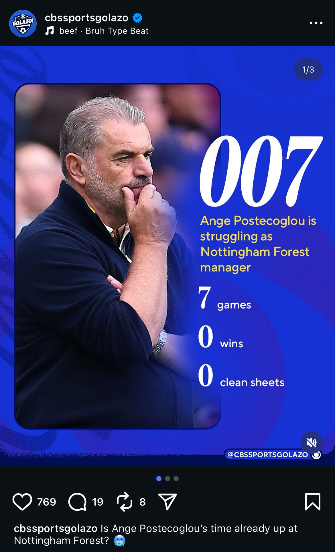 특히 모든 경기에서 실점을 허용하며 새로운 조롱 사진도 만들어졌다. CBS스포츠 골라소는 "포스테코글루는 노팅엄 감독으로서 어려움을 겪고 있다"며 7경기 0승, 0무실점을 기록했다며 유명 첩보영화 '007'로 조롱했다. 포스테코글루 감독을 007 주연인 제임스 본드처럼 합성한 사진도 나왔다.