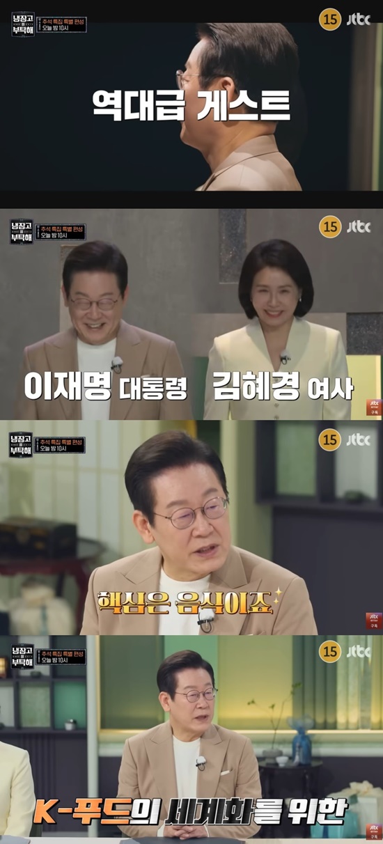 김혜경 여사와 함께 등장한 이 대통령은 '냉장고를 부탁해' 출연을 결정한 이유로 "K-POP과 드라마도 중요한데, 진짜 문화의 핵심은 음식이다"라며 K-푸드를 널리 알리고 싶다는 바람을 전했다.