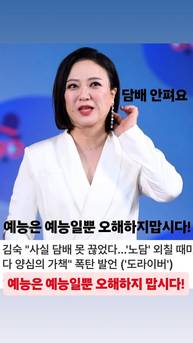 김숙은 "녹화가 잘되고 스트레스 없는 날 삼시 세끼 식후 땅. 딱 세 개비로 버팁니다. 솔직히 담배 연기에 모든 걱정과 시름을 날려버릴 때면 정말이지 이만한 게 없다는 생각이 듭니다. 그러나 이제 저 숙이. 앞으로는 정말이지 식후땡 세 개비만 피는 걸로 약속드리겠습니다"라고 말했다.