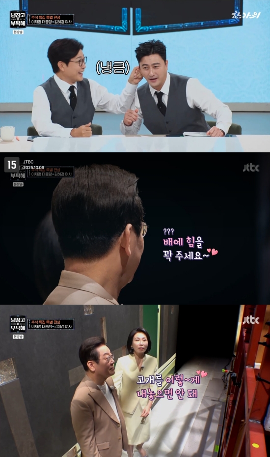 '냉부해'의 초특급 게스트는 이재명 대통령과 김혜경 여사였다. 무대 뒤 김 여사는 이 대통령에게 "배에 힘을 꽉 줘라"라며 조언을 했고, 이에 이 대통령은 "뭔 남 말 하고 있어"라고 말해 웃음을 자아냈다. 또 김 여사는 "고개를 이렇게 내밀면 안 돼 자기야"라고 이 대통령의 자세를 지적했고, 이 대통령은 보란듯이 고개를 내밀어 티격태격 다정한 모습을 보였다.