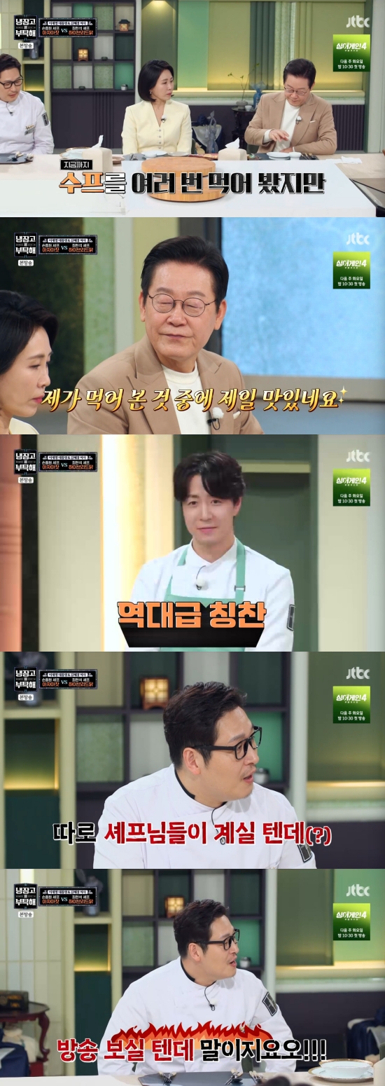이에 김풍은 "먹어본 것 중에 제일 맛있다고 하면 청와대에서 셰프님들이 계실 텐데, 방송 보실 텐데"라며 대통령의 말실수를 꼬집어 웃음을 자아냈다. 이 대통령은 "실수했다"며 너스레를 떨었다.