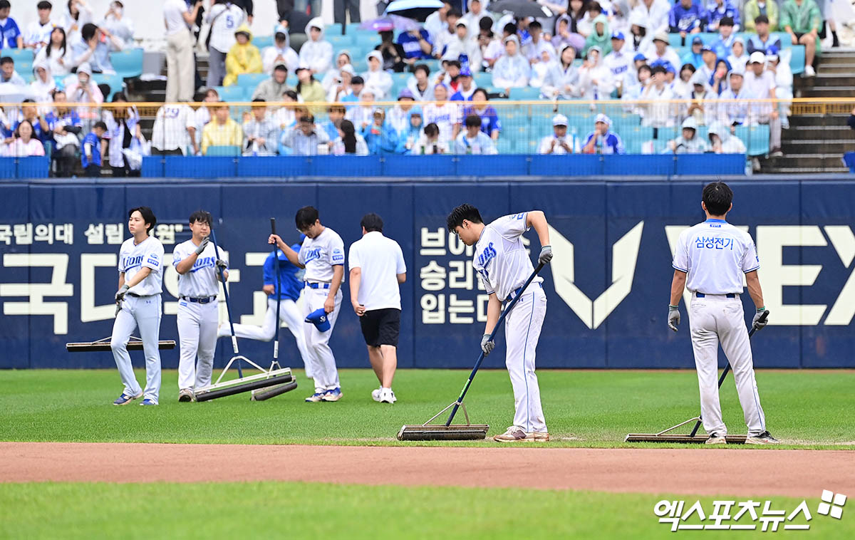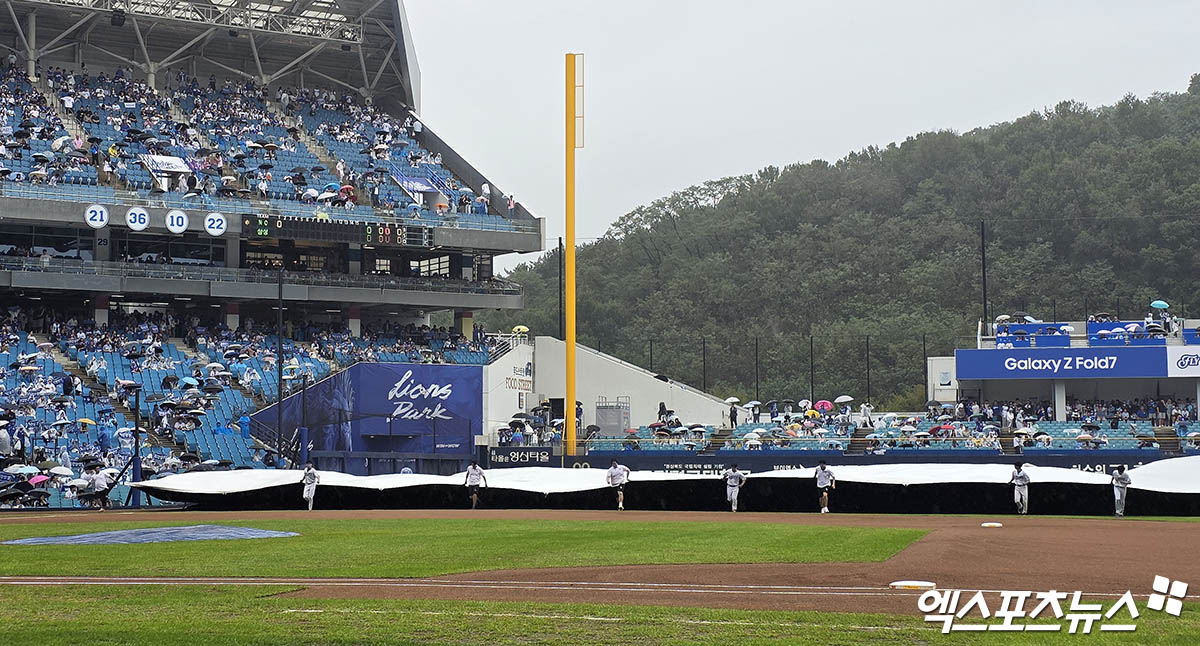 이후 오후 2시 10분을 넘어 빗줄기가 얇아지면서 대형 방수포가 다시 걷히고 그라운드 정비에 돌입했다.