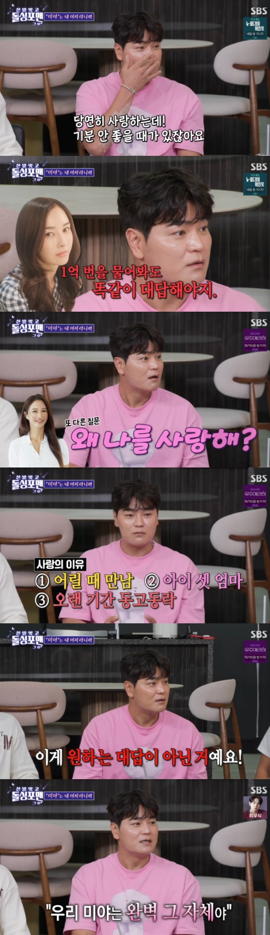 이어 결혼 생활에 대해서는 "아내가 '나를 사랑하냐'고 수시로 물어본다. 진짜로 사랑하는데 계속 물어보면 대충 대답할 때가 있다. 그러면 '내가 1억 번을 물어봐도 똑같이 대답하라'고 한다"면서 힘들어했다.