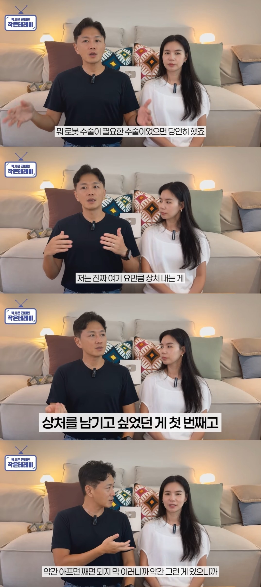 로봇 수술을 택하지 않은 이유에 대해 진태현은 "로봇 수술이 필요했다면 당연히 했다. 저는 목에 요만큼 상처 내는 게 큰일인가 싶었다. 상처를 남기고 싶었다"고 말했다.