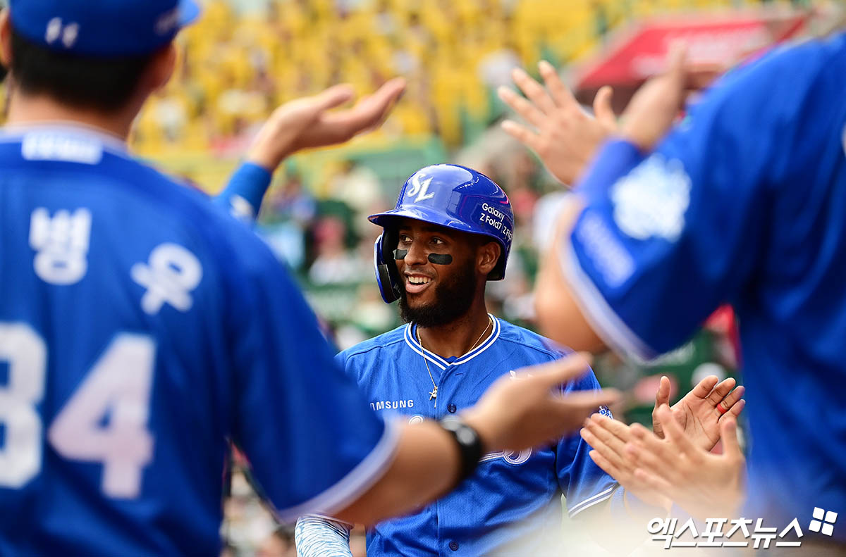 (엑스포츠뉴스 인천, 박지영 기자) 9일 오후 인천SSG랜더스필드에서 열린 '2025 신한 SOL Bank KBO 포스트시즌' 삼성 라이온즈와 SSG 랜더스의 준플레이오프 1차전 경기, 4회초 1사 2루 삼성 김지찬의 적시타 때 2루주자 디아즈가 득점을 올린 뒤 더그아웃에서 동료들과 하이파이브를 나누고 있다.