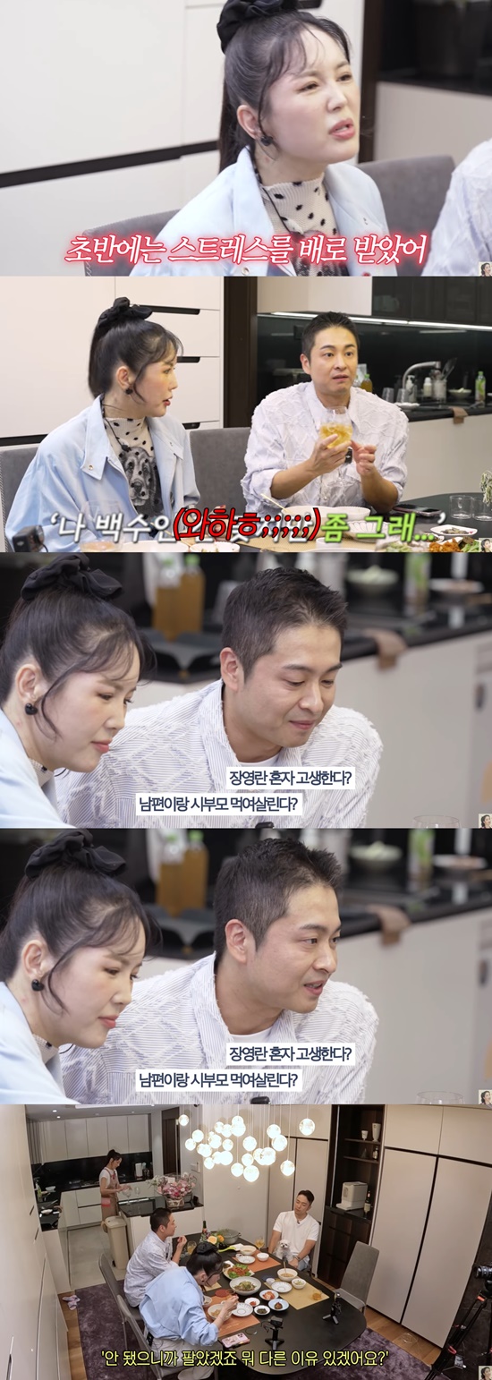 신영수는 “처음에는 안 괜찮았다. 지금도 스트레스”라고 했고, 장영란은 “남편이 처음에 많이 스트레스를 받았다. 형부도 능력 있는 사람이지 않냐”고 했다.