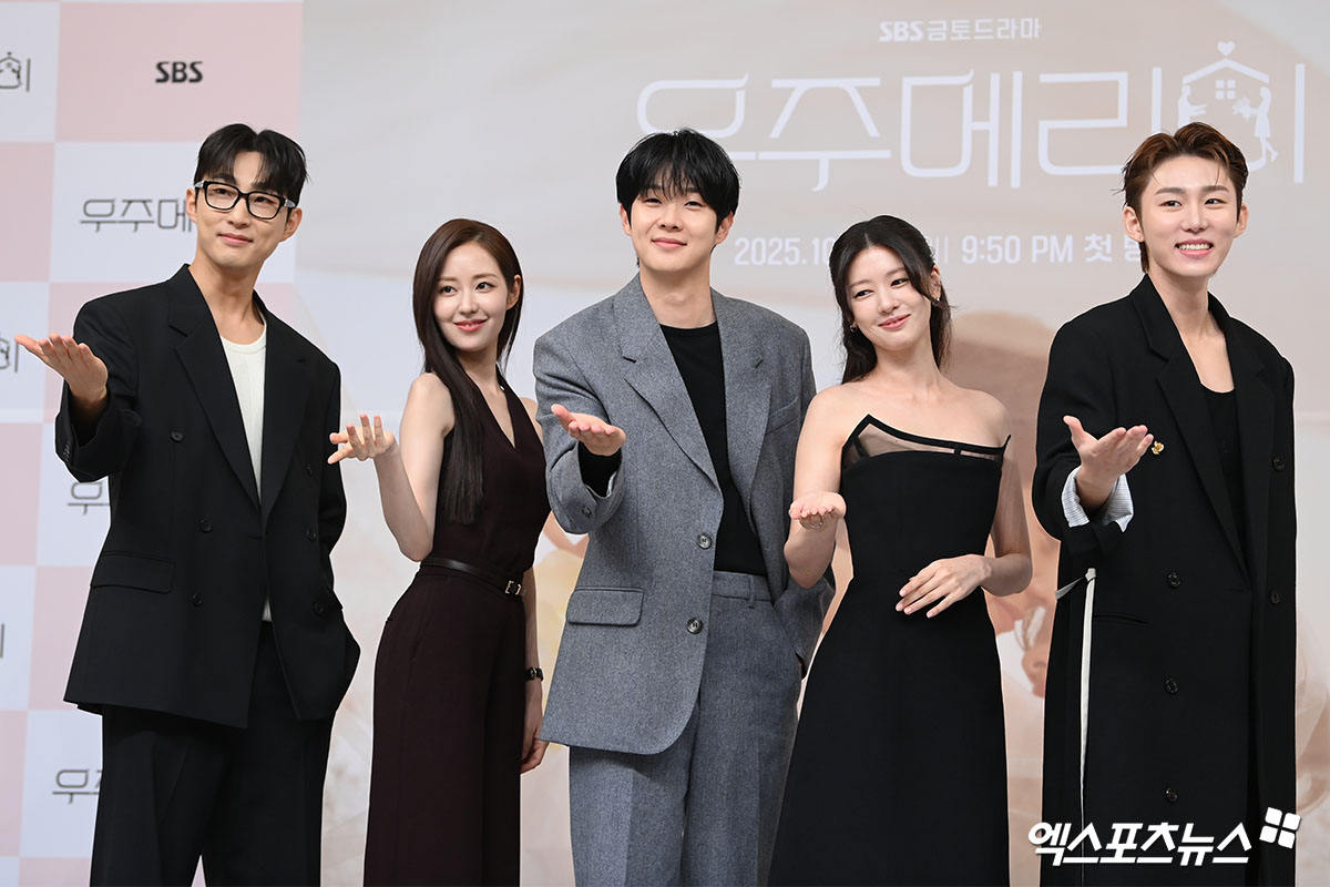 10일 오후 서울 양천구 목동 SBS에서 SBS 새 금토드라마 '우주메리미'의 제작발표회가 열렸다. 현장에는 배우 최우식, 정소민, 배나라, 신슬기, 서범준과 송현욱 감독이 참석했다.