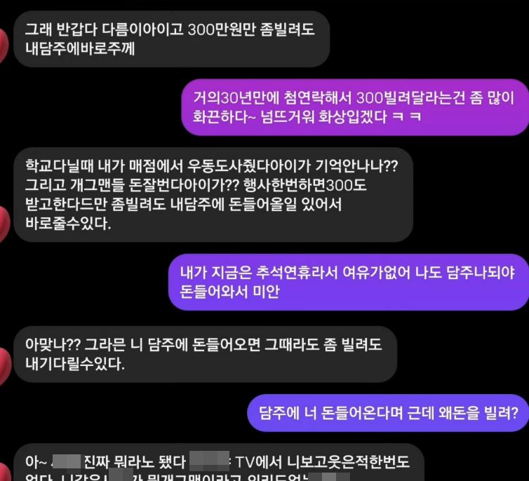 이어 "학교 다닐 때 내가 매점에서 우동도 사주지 않았냐. 그리고 개그맨들 돈 잘 벌지 않냐. 행사 한번 하면 300도 받고 한다던데 좀 빌려줘. 다음주에 돈 들어올 일 있어서 바로 줄 수 있다"고 말했다. 이에 김대범은 "거의 30년 만에 연락해서 300 빌려달라는 건 좀 많이 화끈하다"며 추석 연휴 이후에 돈을 빌려줄 수 있다고 답했다.