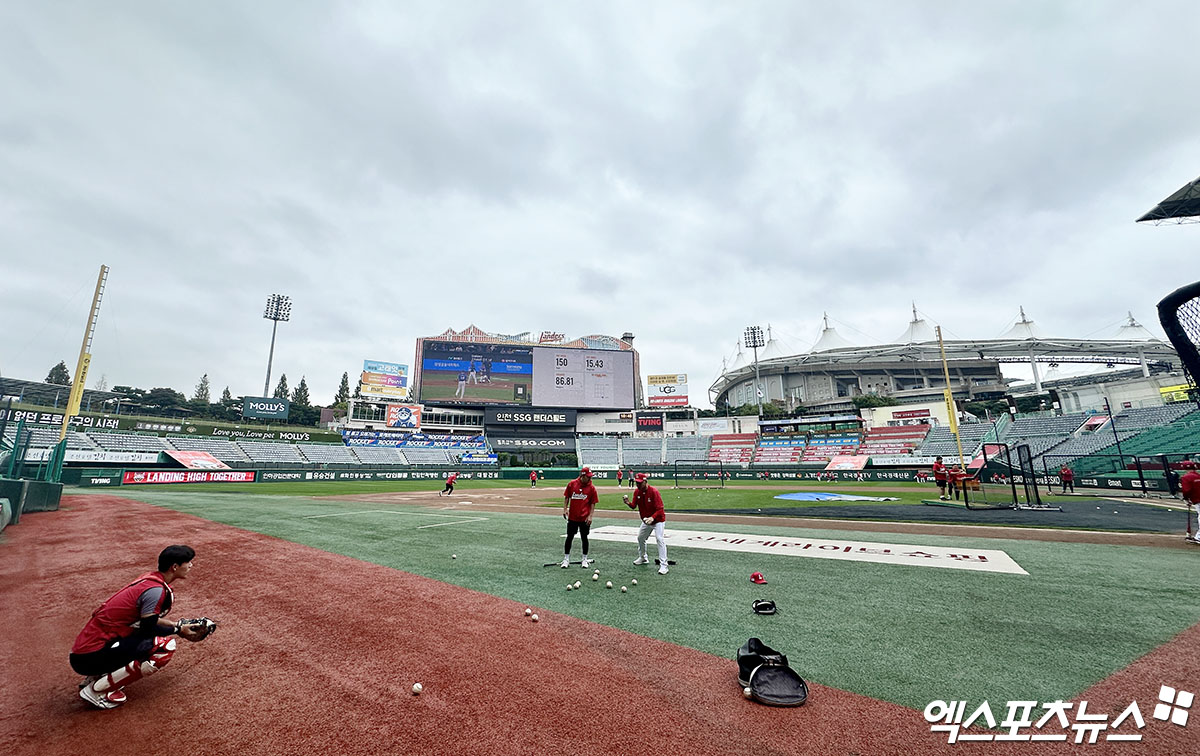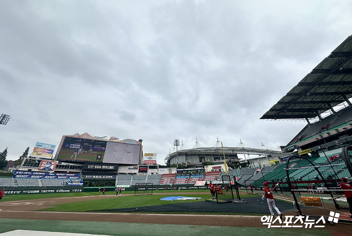 일단 비는 그쳤다. 운동장 관계자들이 일찍 나와 그라운드 정비를 진행했고, 오전 10시 30분께 홈팀 SSG 선수들이 그라운드에서 훈련을 시작했다.