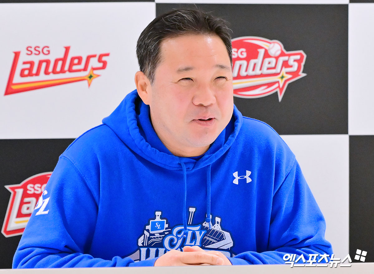 (엑스포츠뉴스 인천, 김한준 기자) 11일 오후 인천SSG랜더스필드에서 열리는 '2025 신한 SOL Bank KBO 포스트시즌' 삼성 라이온즈와 SSG 랜더스의 준플레이오프 2차전 경기, 삼성 박진만 감독이 취재진과 대화를 나누고 있다.