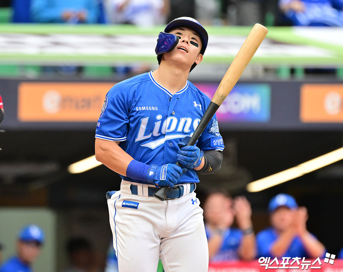 (엑스포츠뉴스 인천, 김한준 기자) 11일 오후 인천SSG랜더스필드에서 열린 '2025 신한 SOL Bank KBO 포스트시즌' 삼성 라이온즈와 SSG 랜더스의 준플레이오프 2차전 경기, 5회초 2사 2루 삼성 김성윤이 볼넷으로 출루하고 있다.