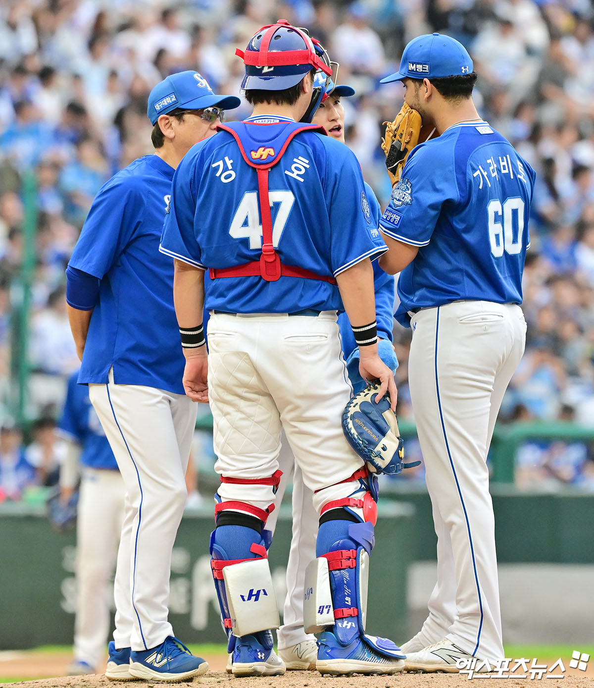 (엑스포츠뉴스 인천, 김한준 기자) 11일 오후 인천SSG랜더스필드에서 열린 '2025 신한 SOL Bank KBO 포스트시즌' 삼성 라이온즈와 SSG 랜더스의 준플레이오프 2차전 경기, 5회말 2사 1루 삼성 최일언 투수코치가 마운드를 방문하고 있다.
