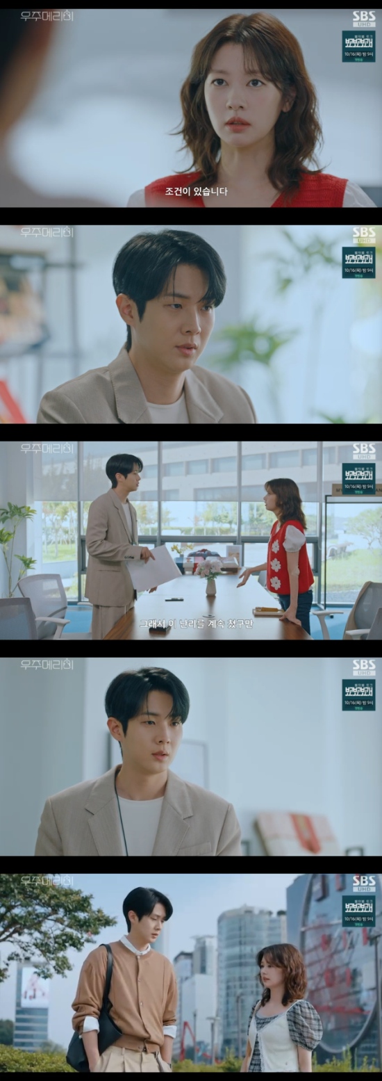 11일 방송된 SBS 금토드라마 '우주메리미' 2회에서는 가짜 남편이 되어달라고하는 유메리(정소민 분)의 부탁을 들어주게 된 김우주(최우식)의 모습이 그려졌다.