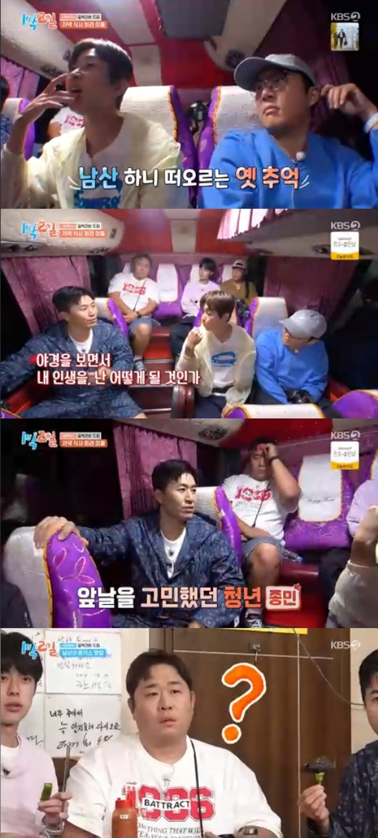 12일 방송된 KBS 2TV '1박 2일 시즌4'에서는 김종민, 문세윤, 조세호, 이준, 딘딘, 유선호가 서울 남산으로 향하는 모습이 전파를 탔다.