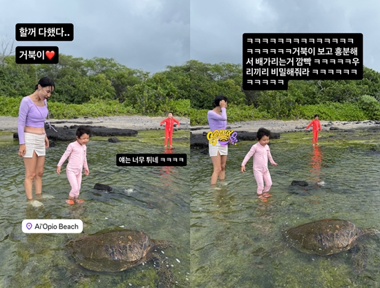 13일 이지혜는 "할 거 다했다. 거북이"라는 글과 함께 하와이 해변에서 두 딸과 여유로운 시간을 보내고 있는 사진을 올렸다.