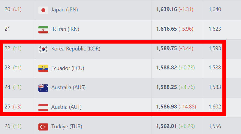 한국은 오히려 순위가 올라 13일 기준 실시간 순위 22위가 됐다. 이 순위만 유지하면 조추첨 포트2 배정에 문제가 없다.