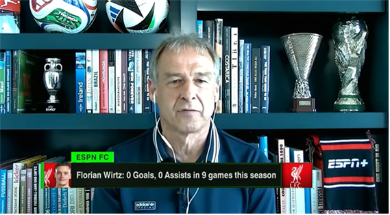 글로벌 스포츠 매체 ESPN이 지난 13일(한국시간) 방송을 통해 엄청난 이적료를 기록하며 이적한 비르츠의 부진에 대해 이야기하는 시간을 가졌다. 이 자리에 클린스만 전 대한민국 축구 대표팀 감독이 등장해 그를 옹호하고 나섰다.