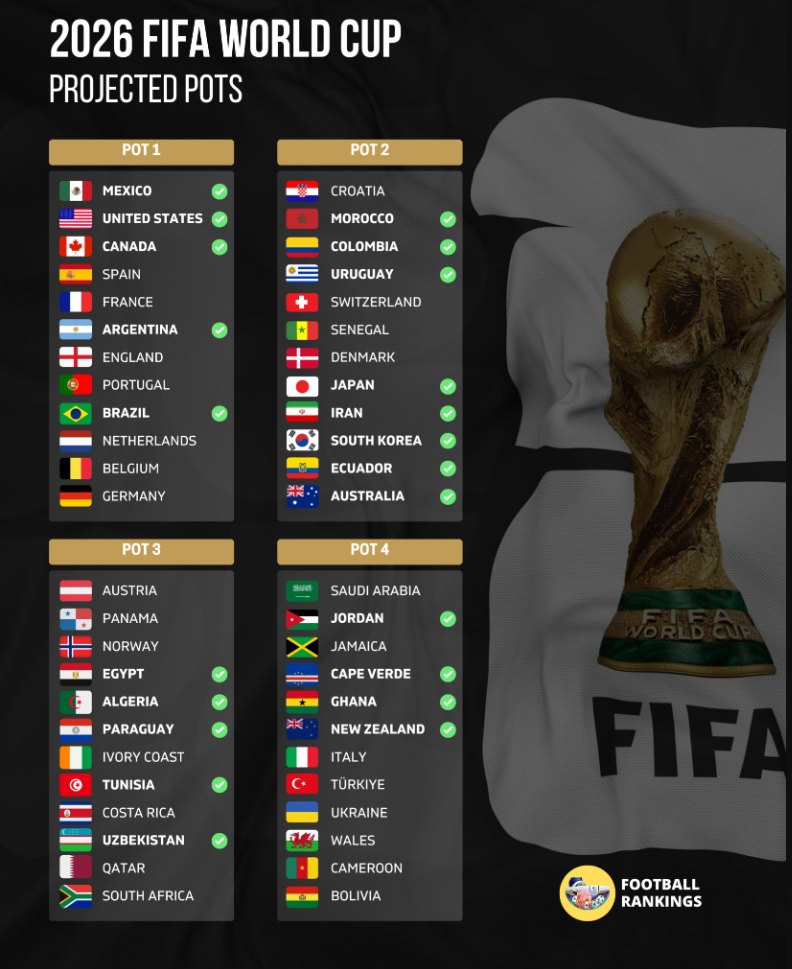 48개국이 참가하는 북중미 월드컵 조별리그 추첨 때 개최국인 미국, 멕시코 캐나다는 본선 진출이 확정된 국가들 중 FIFA 랭킹이 가장 높은 9개국과 포트1에 배정된다. FIFA 랭킹 상위 10~21위는 포트2, 22~33위는 포트 3, 그리고 34~45위가 포트4에 속하게 된다.