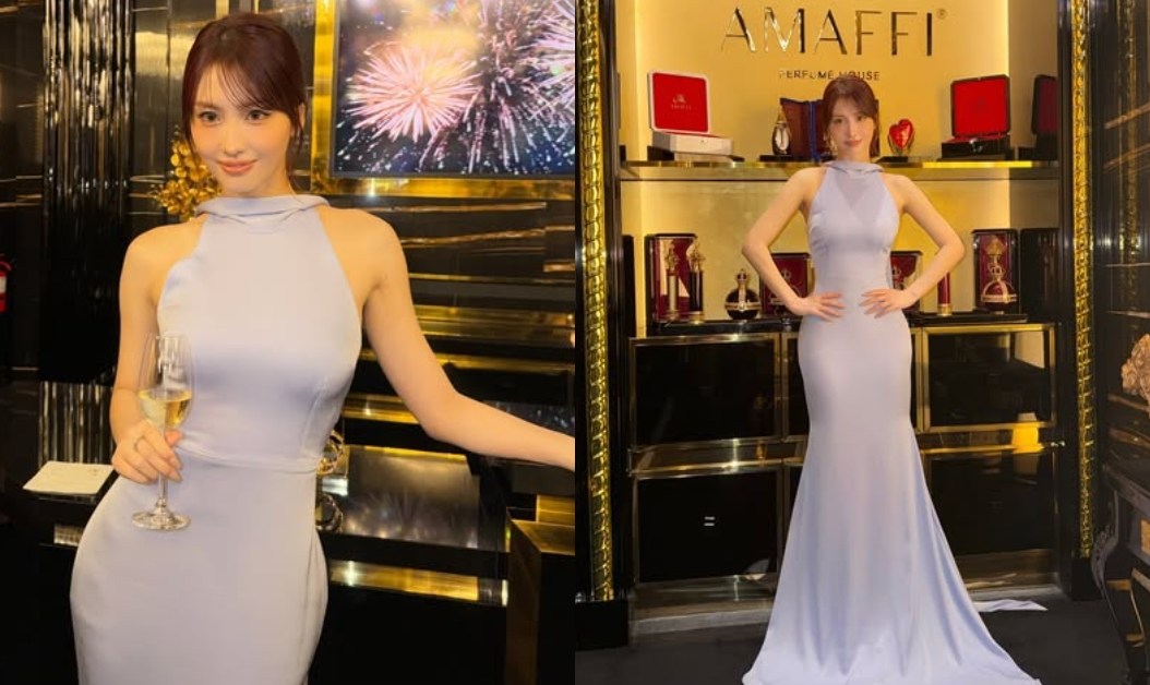 사진 속 모모는 향수 전시대 앞에서 포즈를 취했다. 인형 같은 이목구비와 탄탄한 S라인 몸매로 시선을 잡아끌었다.