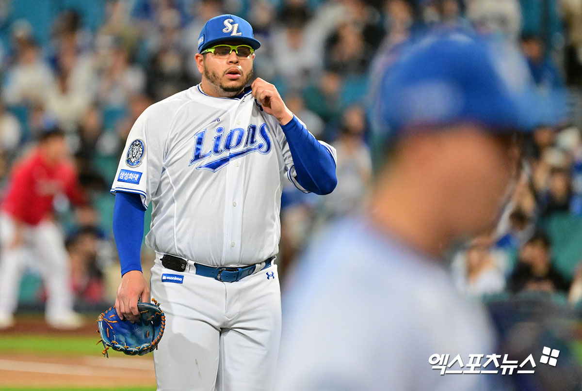 (엑스포츠뉴스 대구, 김한준 기자) 14일 오후 대구삼성라이온즈파크에서 열린 '2025 신한 SOL Bank KBO 포스트시즌' SSG 랜더스와 삼성 라이온즈의 준플레이오프 4차전 경기, 1회초 수비를 마친 삼성 선발투수 후라도가 더그아웃으로 향하고 있다.