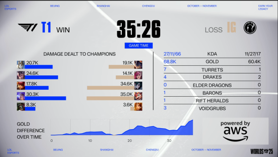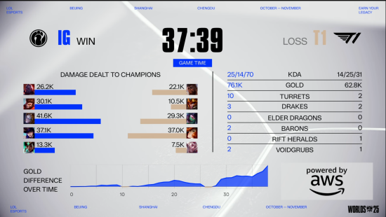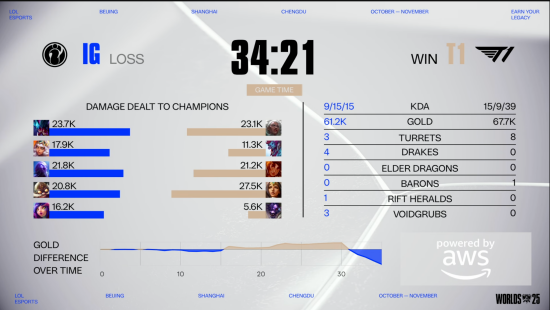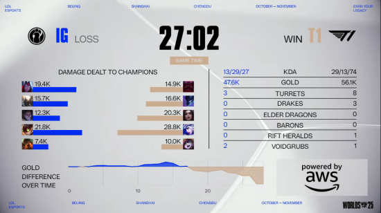 14일, 리그 오브 레전드 2025 월드 챔피언십(이하 월즈) 플레이-인 스테이지가 베이징시 스마트 e스포츠 센터에서 열렸다. 이번 경기는 2025 MSI에서 추가 출전권을 확보한 두 지역의 4번 시드가 맞붙는 자리로, 스위스 스테이지 진출권 단 한 장을 두고 LCK의 T1과 LPL의 Invictus Gaming(이하 IG)이 5판 3선승제로 격돌했다.