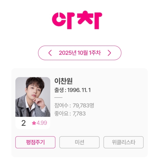 최근 아이돌차트에 따르면, 이찬원은 10월 1주 차 평점랭킹에서 2위를 기록했다.