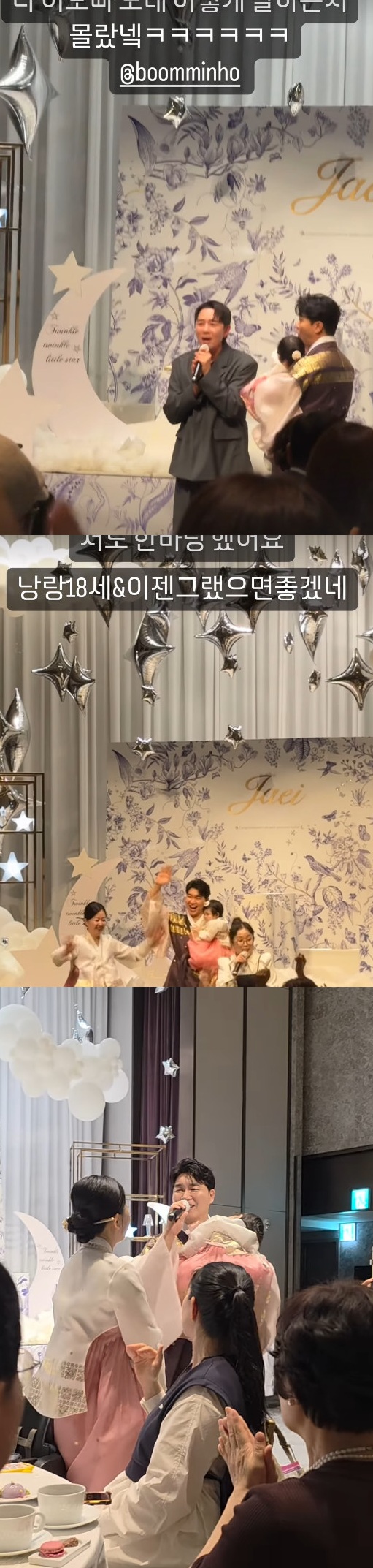 순백의 드레스를 입고 화려한 인형 미모를 뽐낸 김다예와 예쁘게 꾸민 주인공 재이를 안고 있는 정장 차림의 박수홍 사진을 공개한 박슬기는 붐의 립싱크 공연부터 황민호의 힘찬 무대, 심진화의 춤과 박경림의 라이브 공연까지 공개했다.