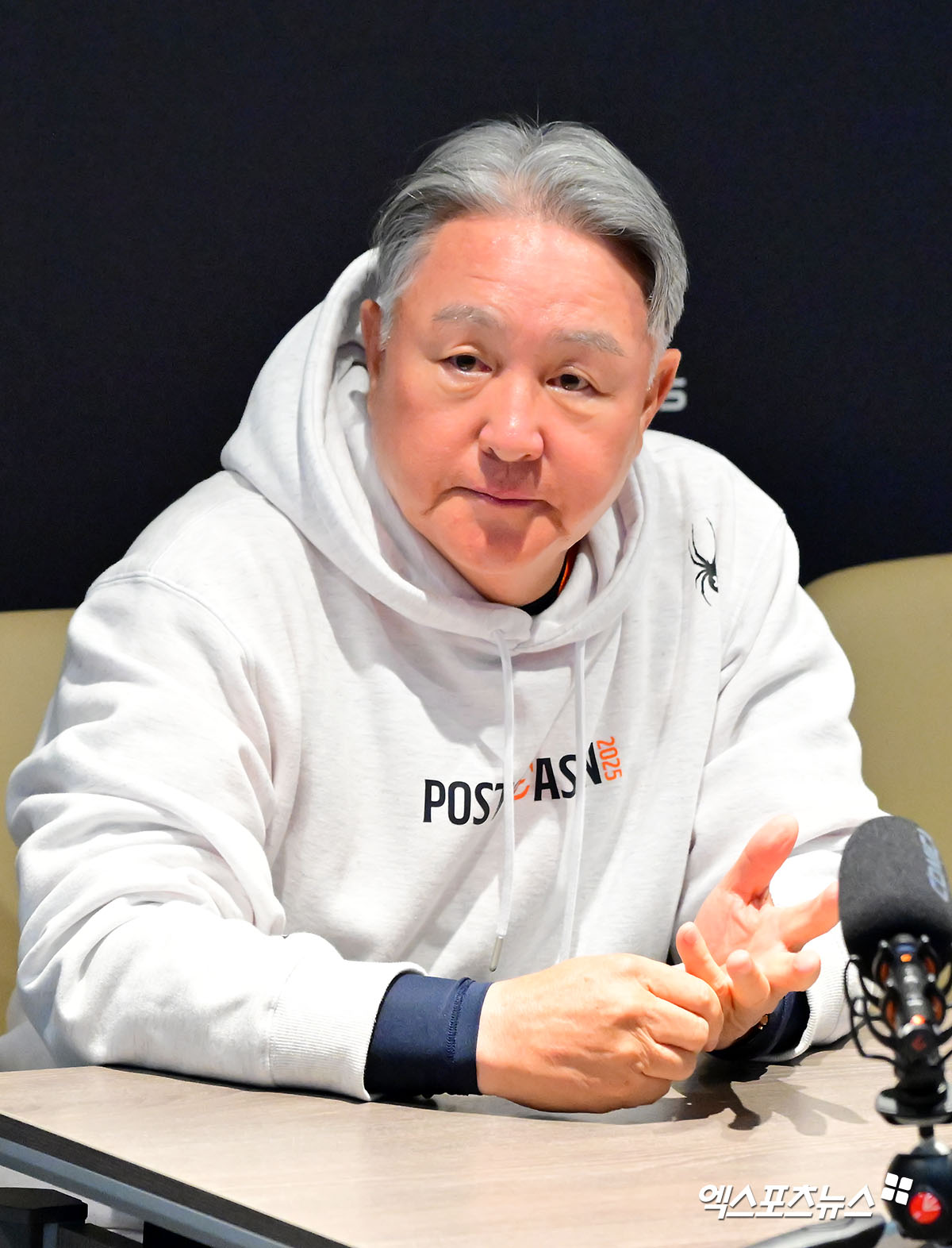 (엑스포츠뉴스 대전, 김한준 기자) 17일 오후 대전 한화생명 볼파크에서 열리는 '2025 신한 SOL Bank KBO 포스트시즌' 삼성 라이온즈와 한화 이글스의 플레이오프 1차전 경기, 한화 김경문 감독이 취재진의 질문을 듣고 있다.